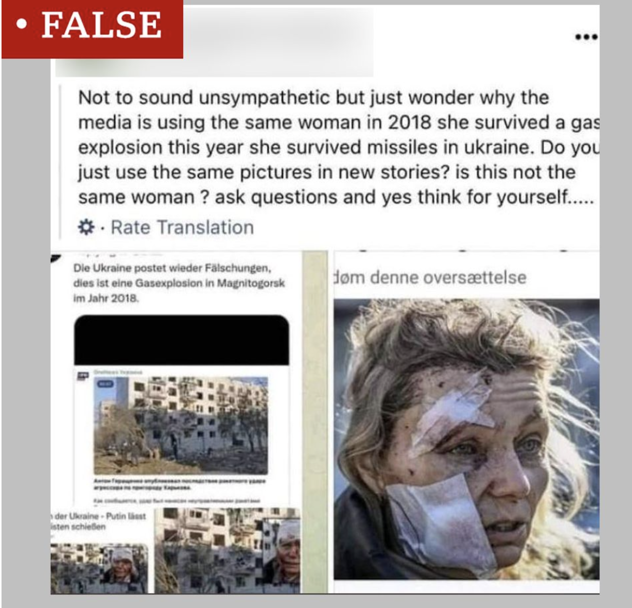 Effectivement, le cliché d'Aris Messinis a été utilisé sur certains comptes Twitter pour véhiculer des infox. Certains tweets remettent en question l'information, et se demandent pourquoi les médias utilisent la même femme qui a survécu en 2018 à une explosion de gaz pour raconter une autre histoire. D'autres tweets indiquent que la femme sur la photo est une comédienne professionnelle engagée pour servir la cause ukrainienne.  Pour vous apprendre à débusquer les infox qui circulent sur les réseaux sociaux, jouez au quiz YouVerify!