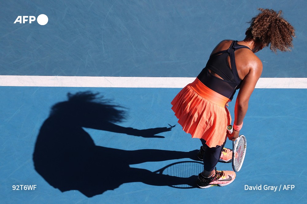 L'ombre de la joueuse japonaise Naomi Osaka est projetée sur le court alors qu'elle enlève délicatement un papillon ayant volé jusque sur sa jupe durant son match de l'édition 2021 de l'Open d'Australie, le 12 février 2021.