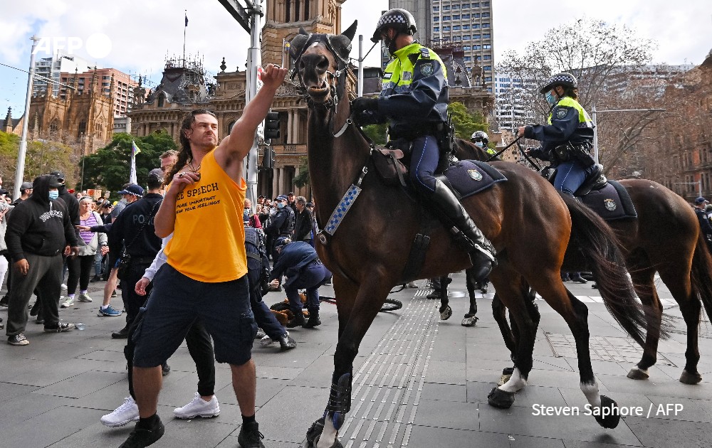 Lors d'une manifestation controversée contre le confinement à Sydney, Steven Saphore a photographié un manifestant frappant à la tête un cheval de la police. Le geste a provoqué l'indignation générale mais a aussi suscité un débat sur la manipulation des médias et la cruauté envers les animaux. L'image a largement circulé sur Internet, et a été nommée "la photo qui a choqué la nation".