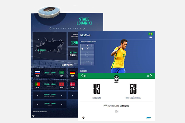 Bénéficiez d'un contenu multimédia automatique intégré et réactualisé 24/7 sur vos supports digitaux. Une analyse graphique et ludique des faits majeurs de la Coupe du Monde. Plongez au coeur de l'événement mondial grâce aux reconstitutions détaillées de la compétition.